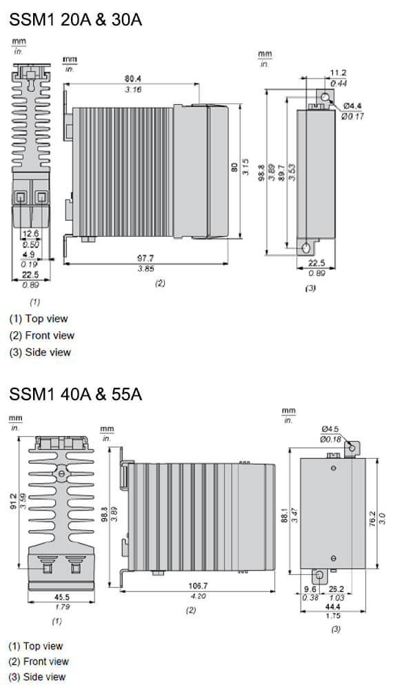 SSM1 relays, 22.5 mm/0.886 in. (20 A, 30 A) width and 45 mm/1.771 in. (45 A, 55 A) width